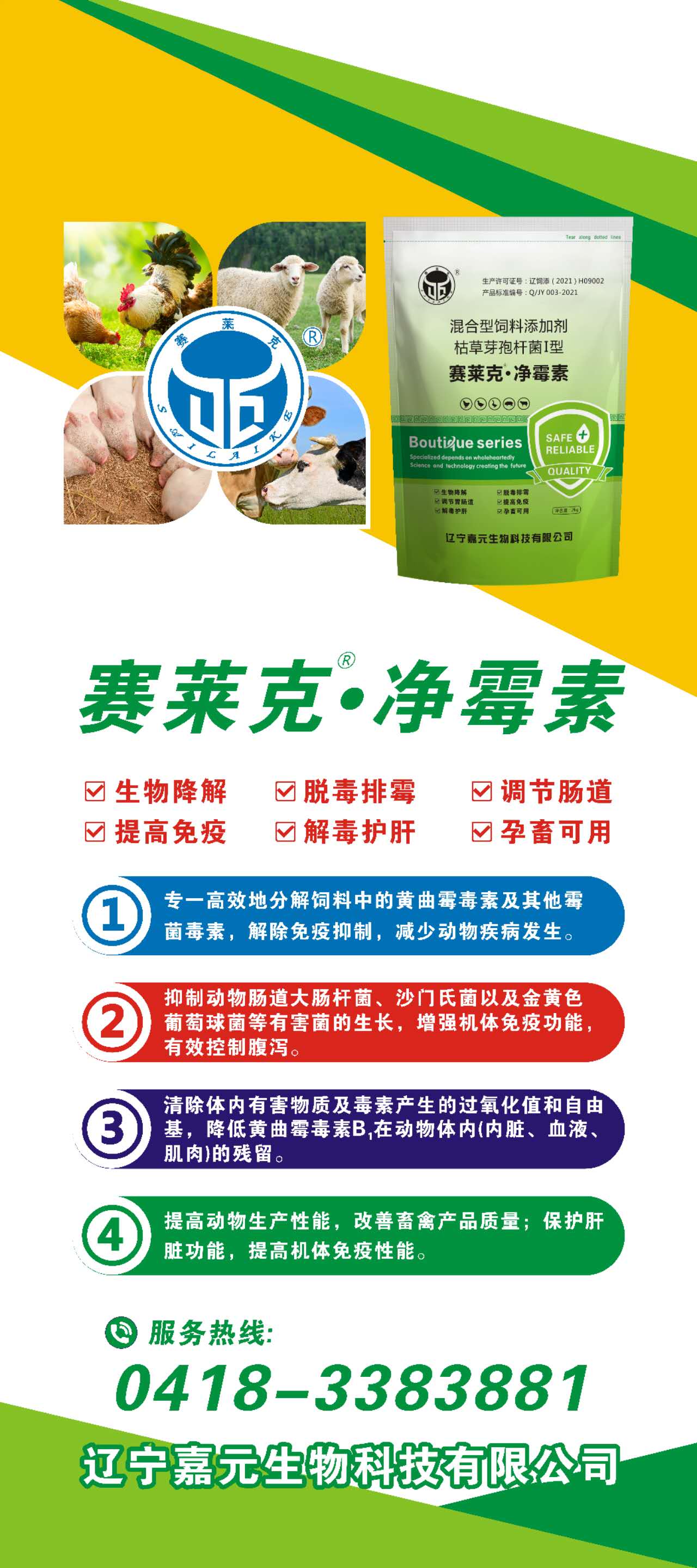 遼寧嘉元生物科技有限公司以在東北三省、內(nèi)蒙古、河南、河北、安徽、新疆、江西等大型養(yǎng)殖地區(qū)取得優(yōu)異成績(jī)。